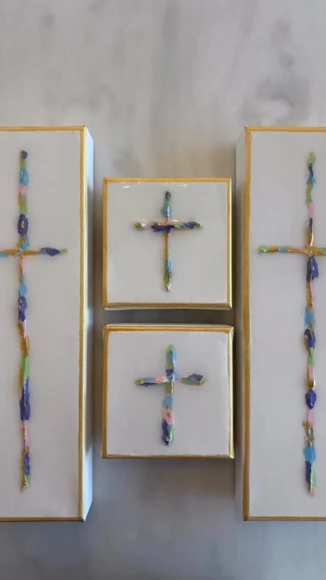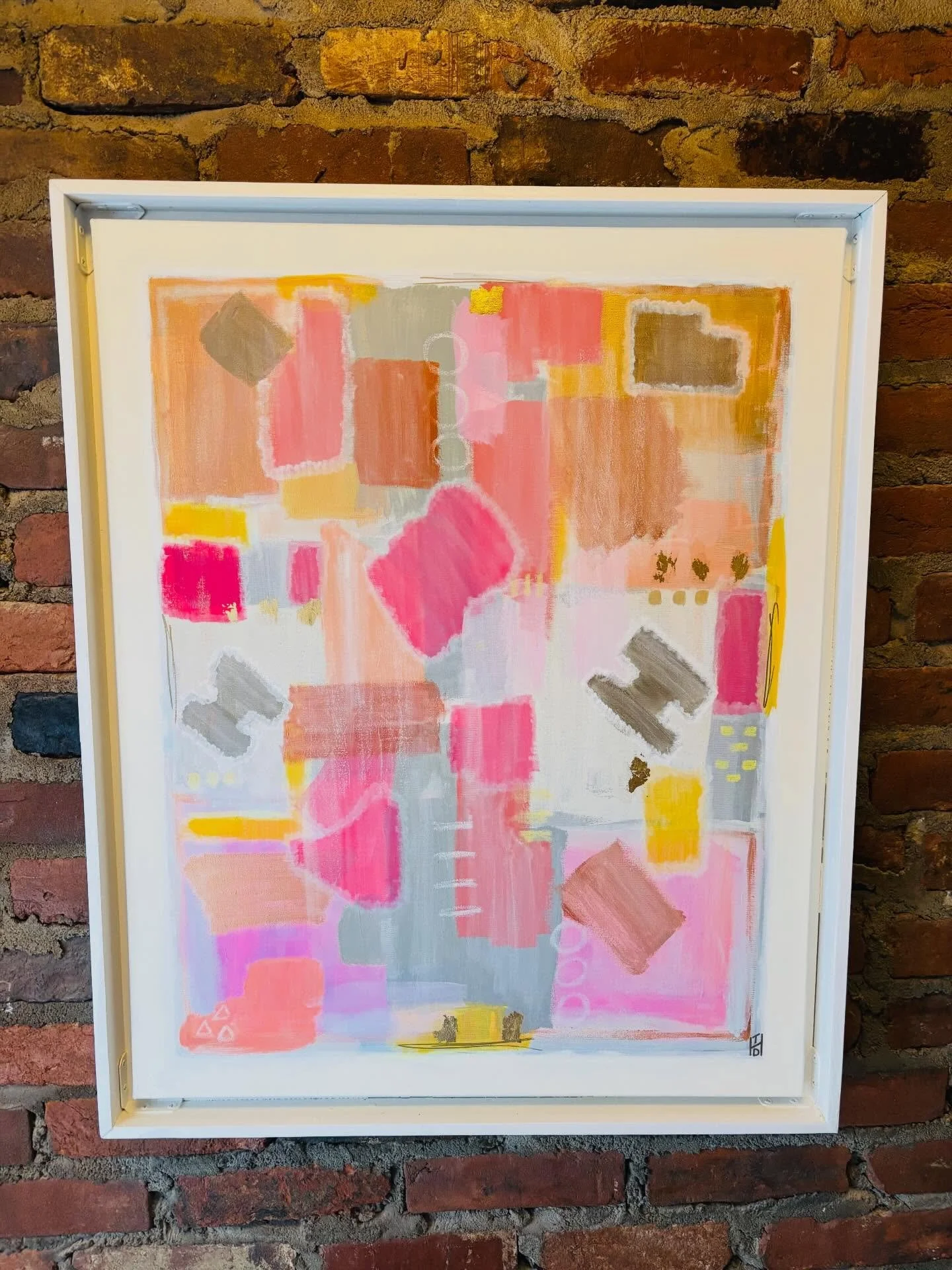 These pieces are all abstract using acrylic on gallery-wrapped canvas. Styles vary from patterned and repeated paint strokes using a palette knife to patterned and geometric using brushes, pastels and metallic leaf. Some pieces have hand-painted borders giving them an ‘already framed’ look.